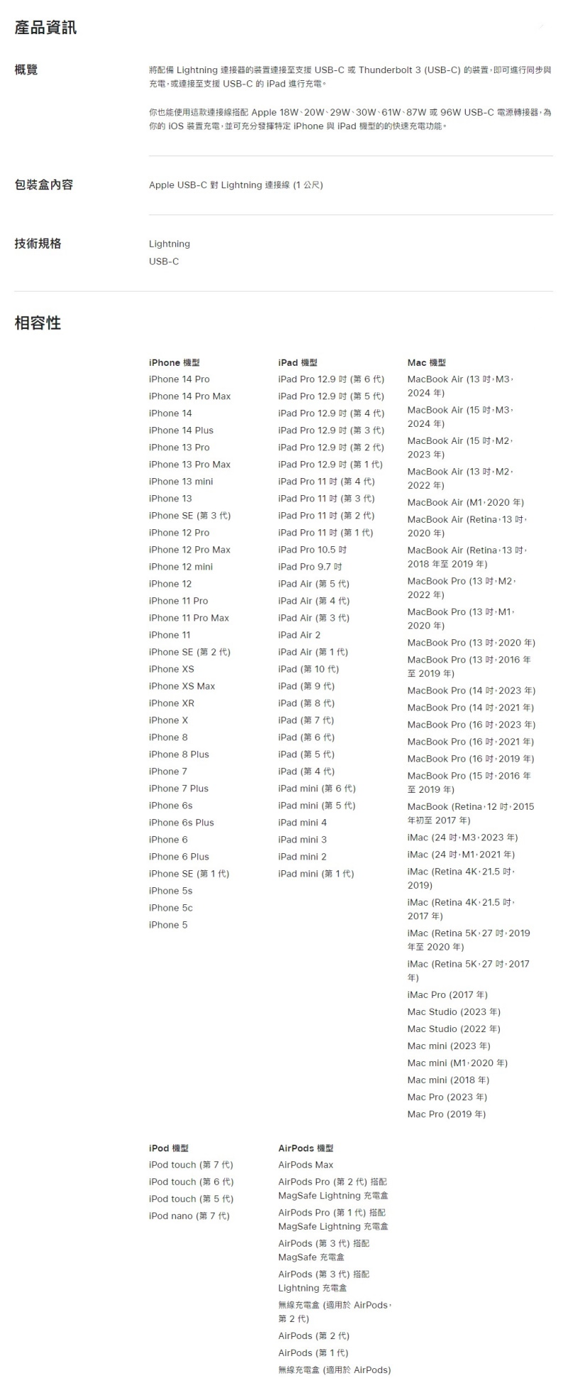MUQ93FE/A APPLE USB-C 對 Lightning 連接線 (1 公尺) 2024
