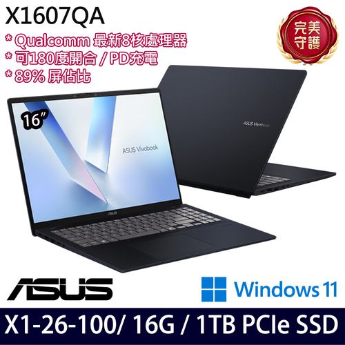 ASUS Vivobook 16吋AI筆電(Snapdragon X X1 26 100/16G/1T SSD/W11/午夜藍)_X1607QA-0061B126100