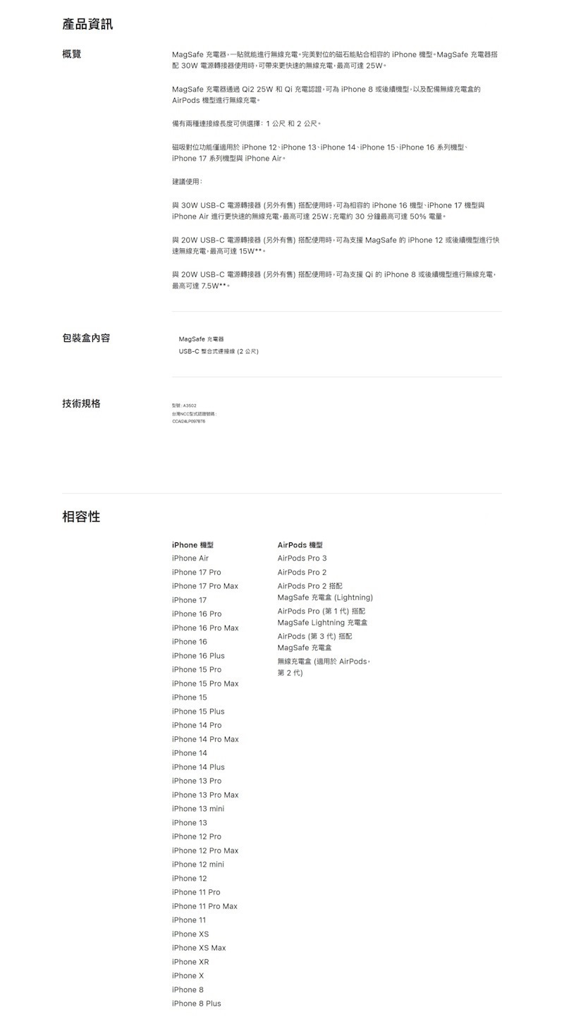 - MagSafe充電器通過Qi2 25W和Qi充電認證,可為iPhone 8或後續機型,以及配備無線充電盒的 AirPods機型進行無線充電