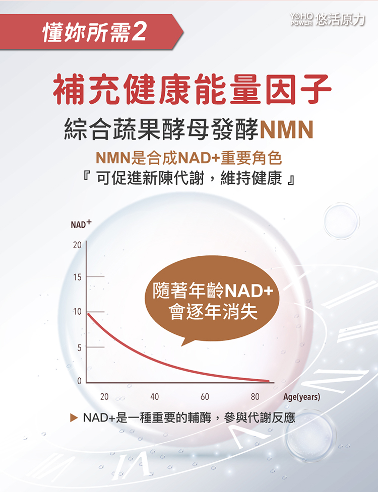 - 特別添加NMN+葡萄總酚-綜合蔬果酵母發酵NMN,搭配美國專利葡萄籽萃取,有助促進新陳代謝,養顏美容。