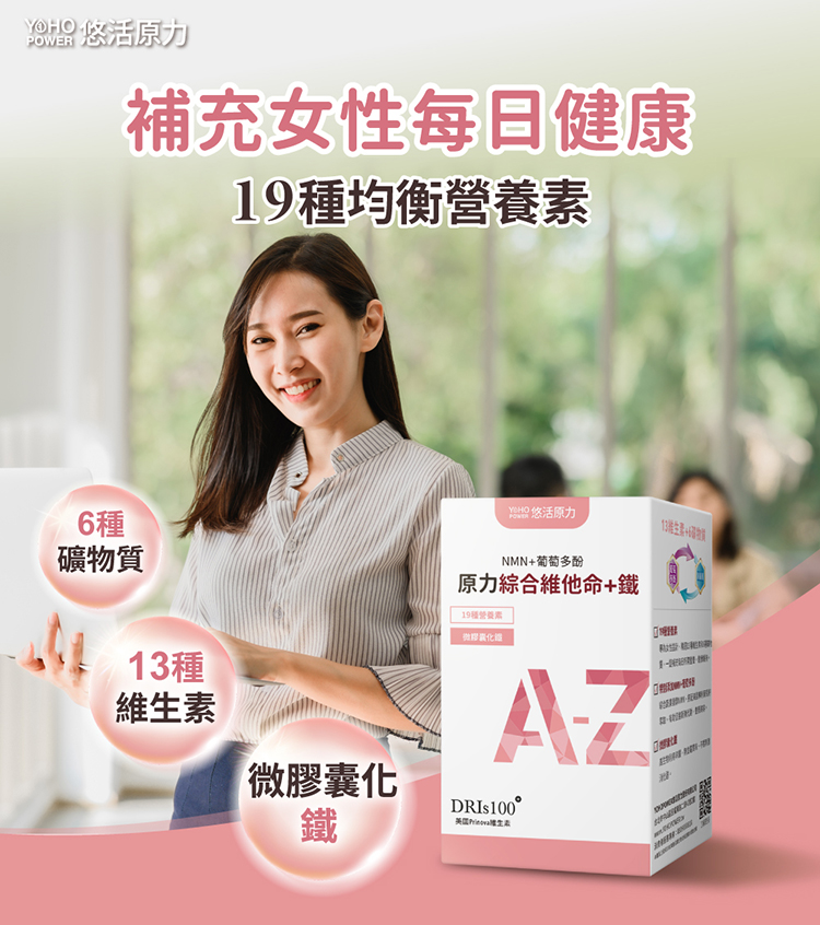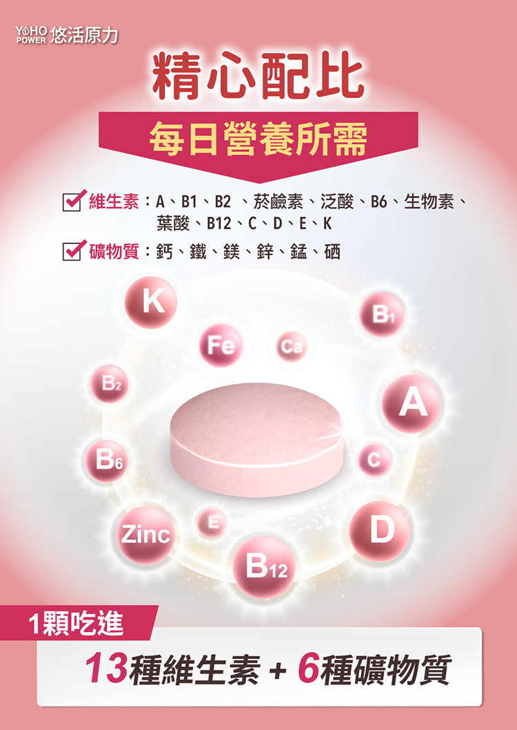 - 19種營養素-專為女性設計,精選13種維生素和6種礦物質,一錠補充每日所需營養,健康維持。