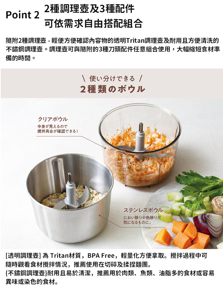- 隨附Tritan調理壺及不鏽鋼調理壺