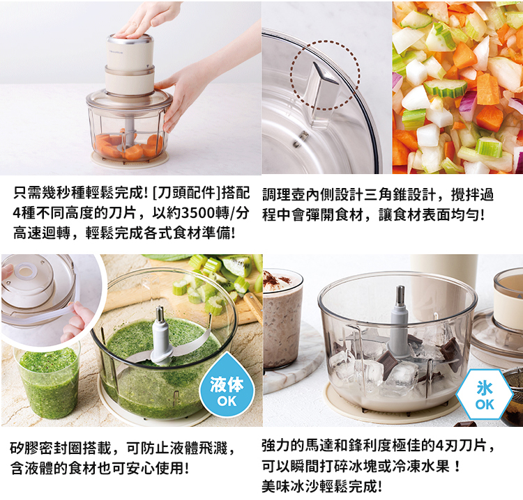 ●高速強力馬達搭配鋒利刀頭配件,可瞬間打碎冰塊或冷凍水果製作美味冰沙!