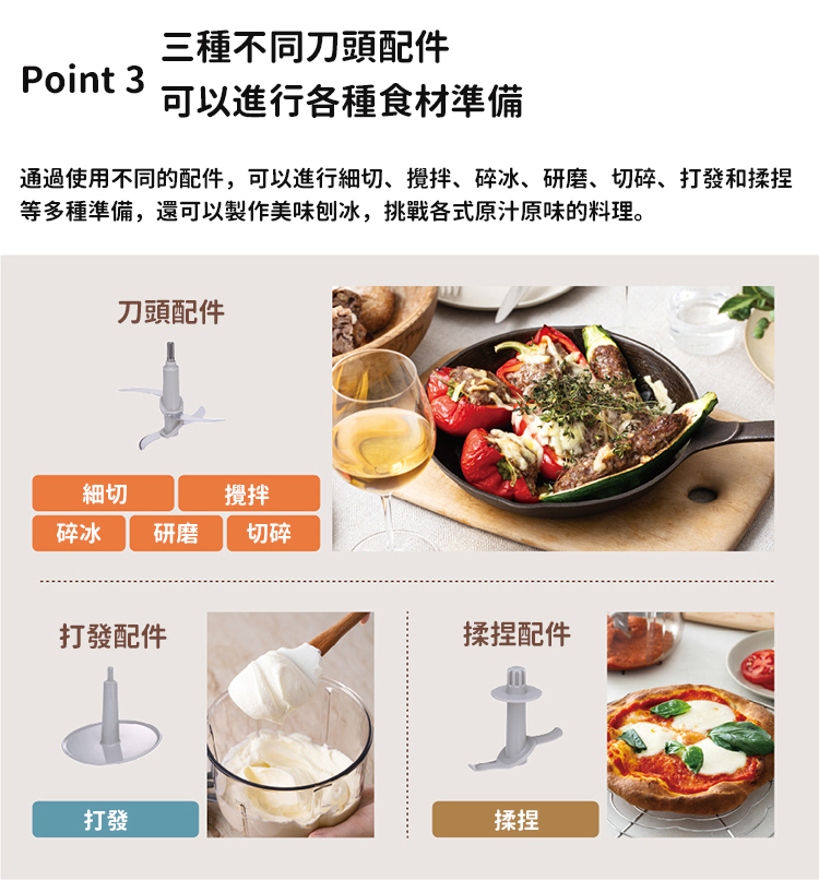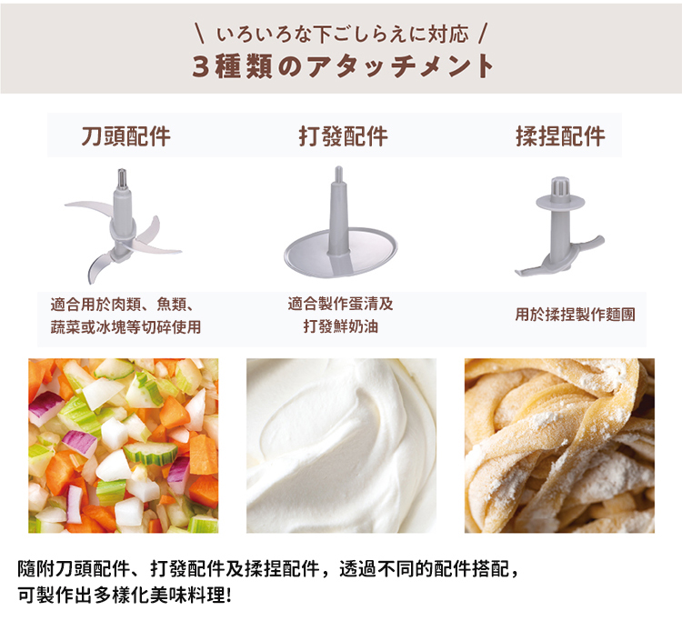 ●隨附四刃刀頭配件、打發配件、揉捏配件三種配件