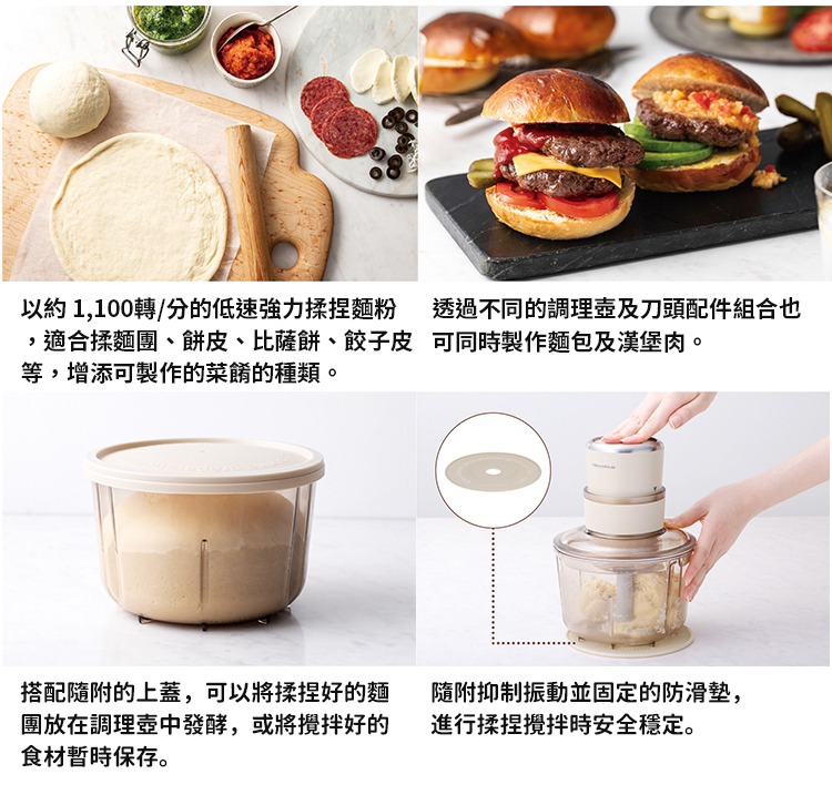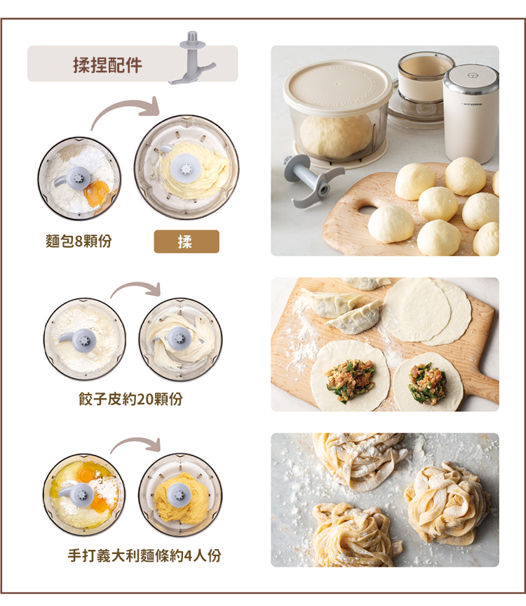 - 低速強力揉捏麵粉,可製作麵團、餅皮、比薩皮或餃子皮等