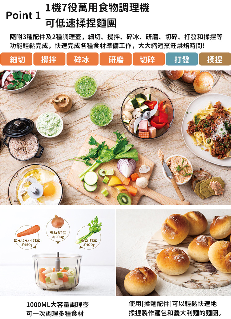 - 1機7役,細切、攪拌、碎冰、研磨、切碎、打發、揉捏等一機完成!