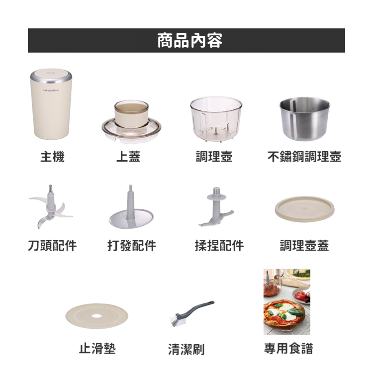 包裝內容 : 主機、調理壺、不鏽鋼調理壺、上蓋、調理壺蓋、刀頭配件、打發配件、揉捏配件、清潔刷、中文操作手冊、商品服務保證卡、27道精緻食譜