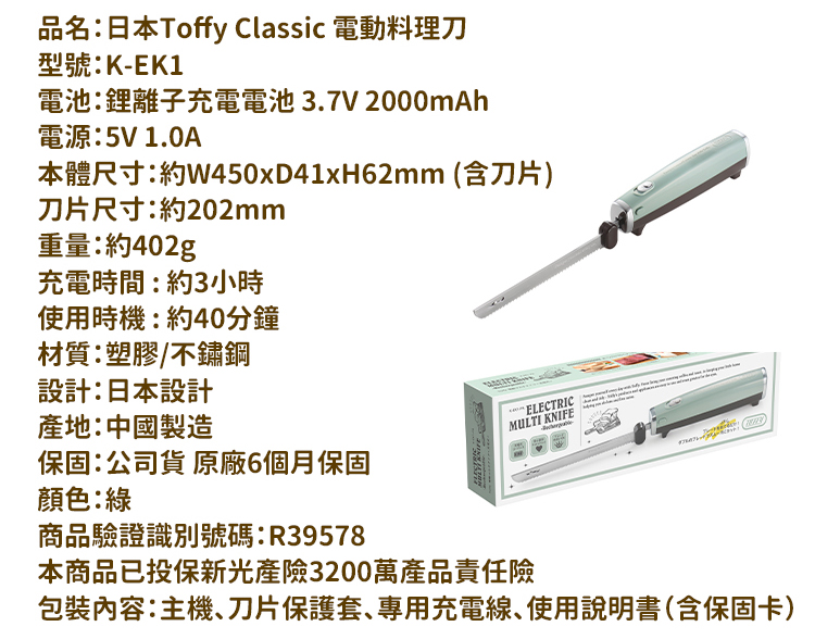 日本Toffy Classic 電動料理刀 K-EK1 綠