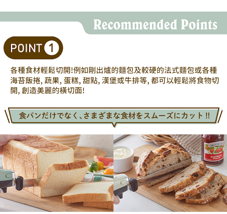- 剛出爐的麵包及較硬的法國麵包等也可以輕鬆切開!