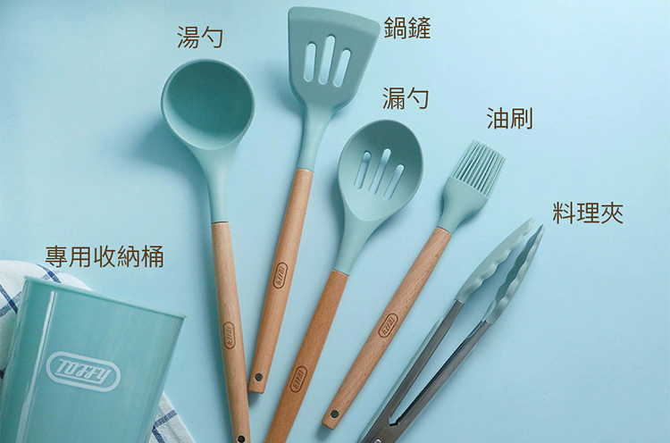 包裝內容:主機、湯勺、漏勺、鍋鏟、油刷、料理夾、專用收納桶、說明卡