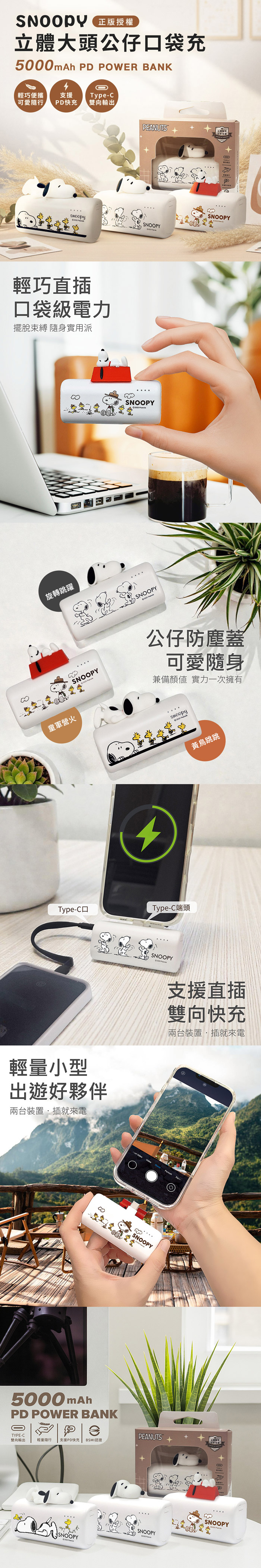 【正版授權】SNOOPY史努比 TYPEC立體大頭公仔口袋充5000mAh-童軍營火