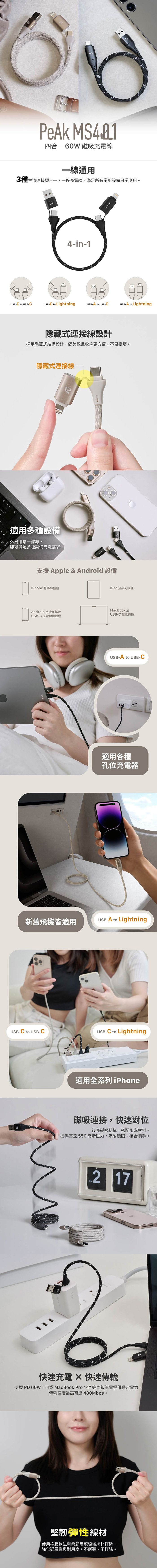 【亞果元素】PeAk MS401 四合一 60W磁吸充電線-鈦色