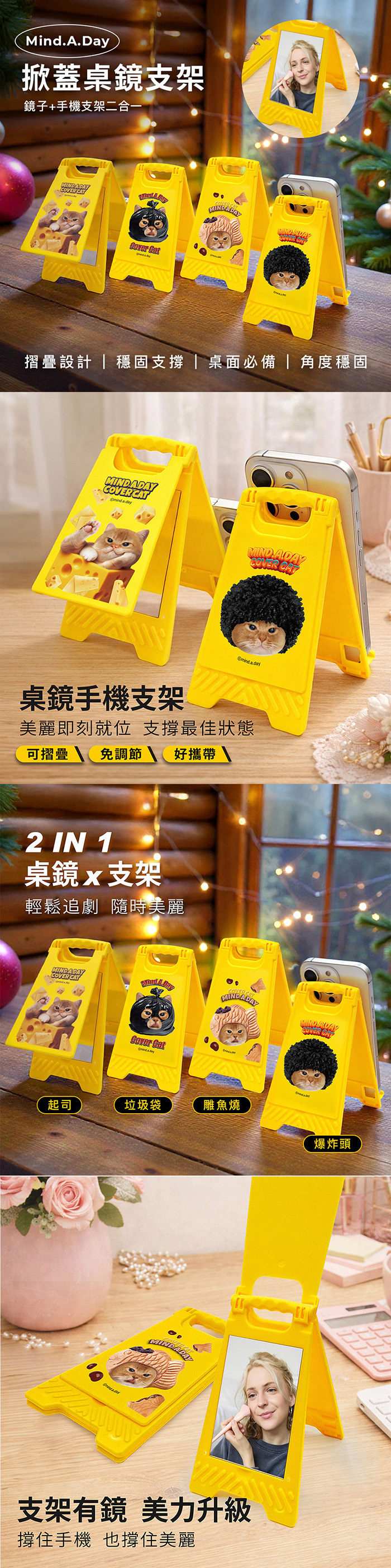 【正版授權】Mind.A.Day貓咪 掀蓋桌鏡手機支架-鯛魚