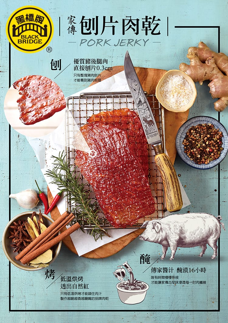 挑選優質豬肉,融入黑橋牌豬肉乾的傳家製程以精心調製的甘醇滷汁,