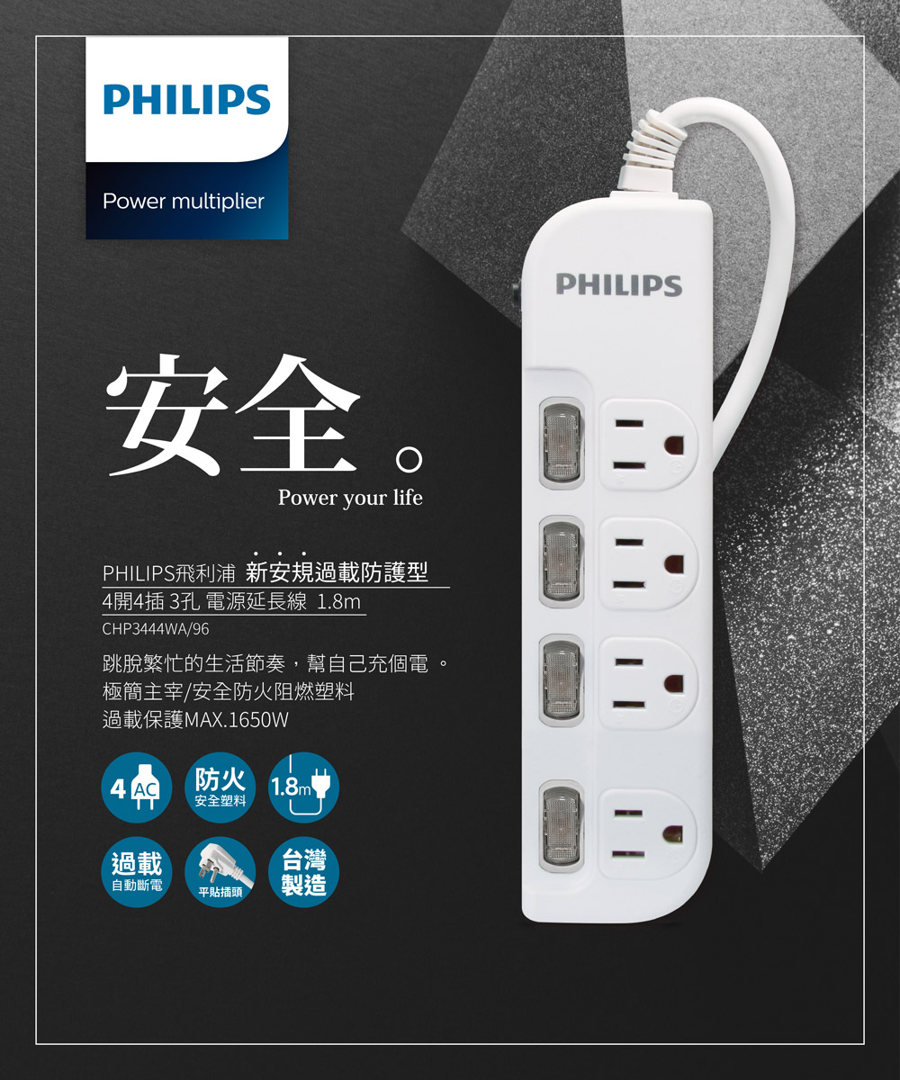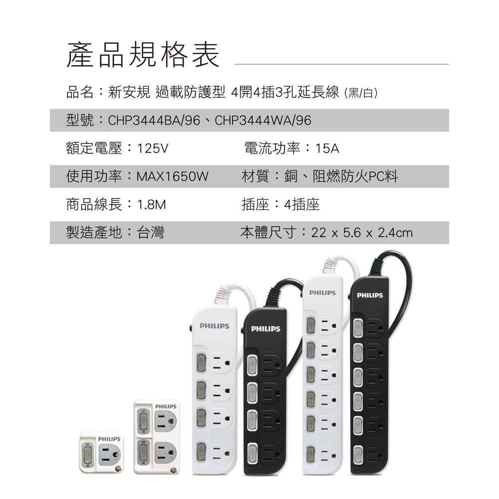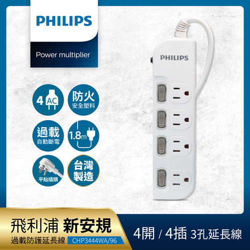 【Philips 飛利浦】延長線四開四插1.8M(白)CHP3444WA