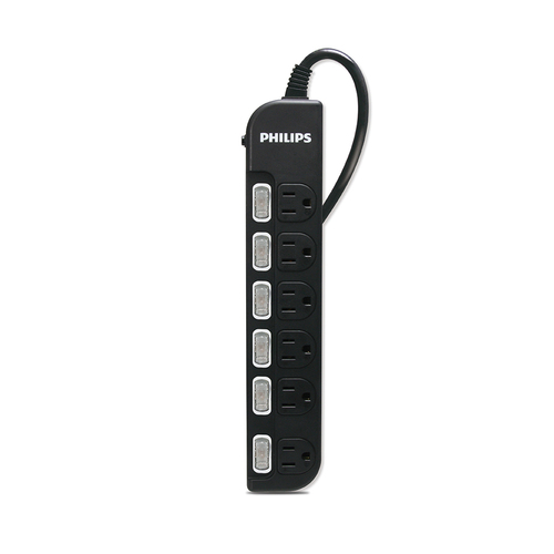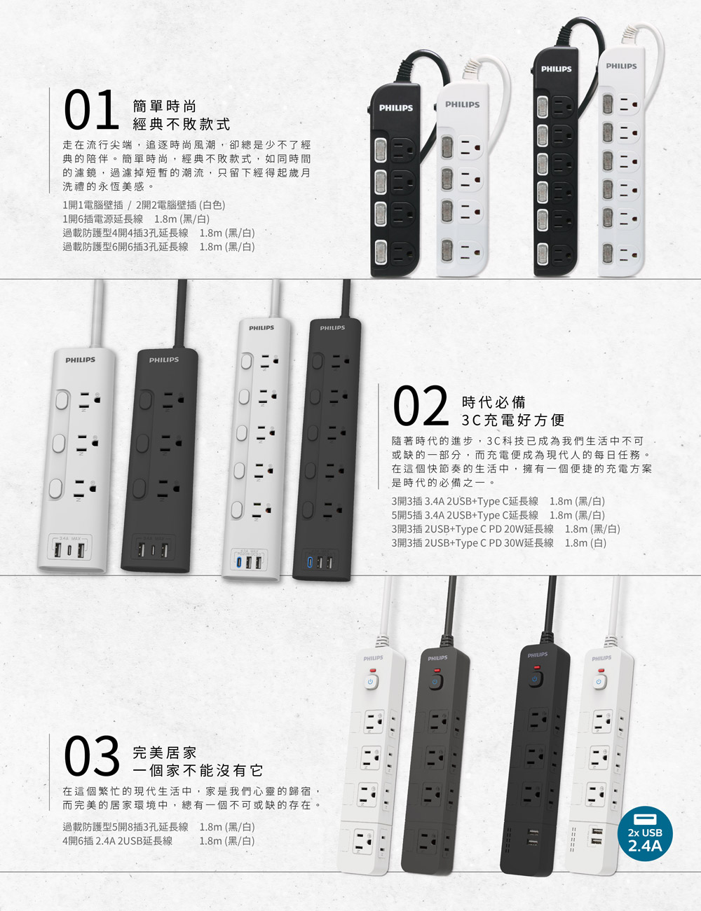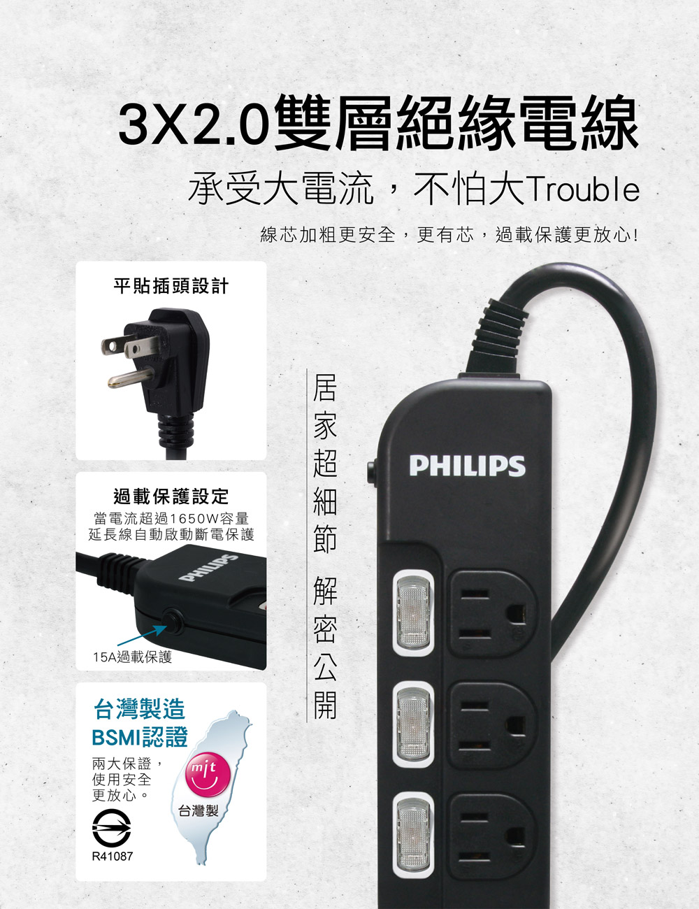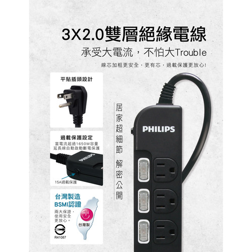 【Philips 飛利浦】延長線六開六插1.8M(黑)CHP3460BA