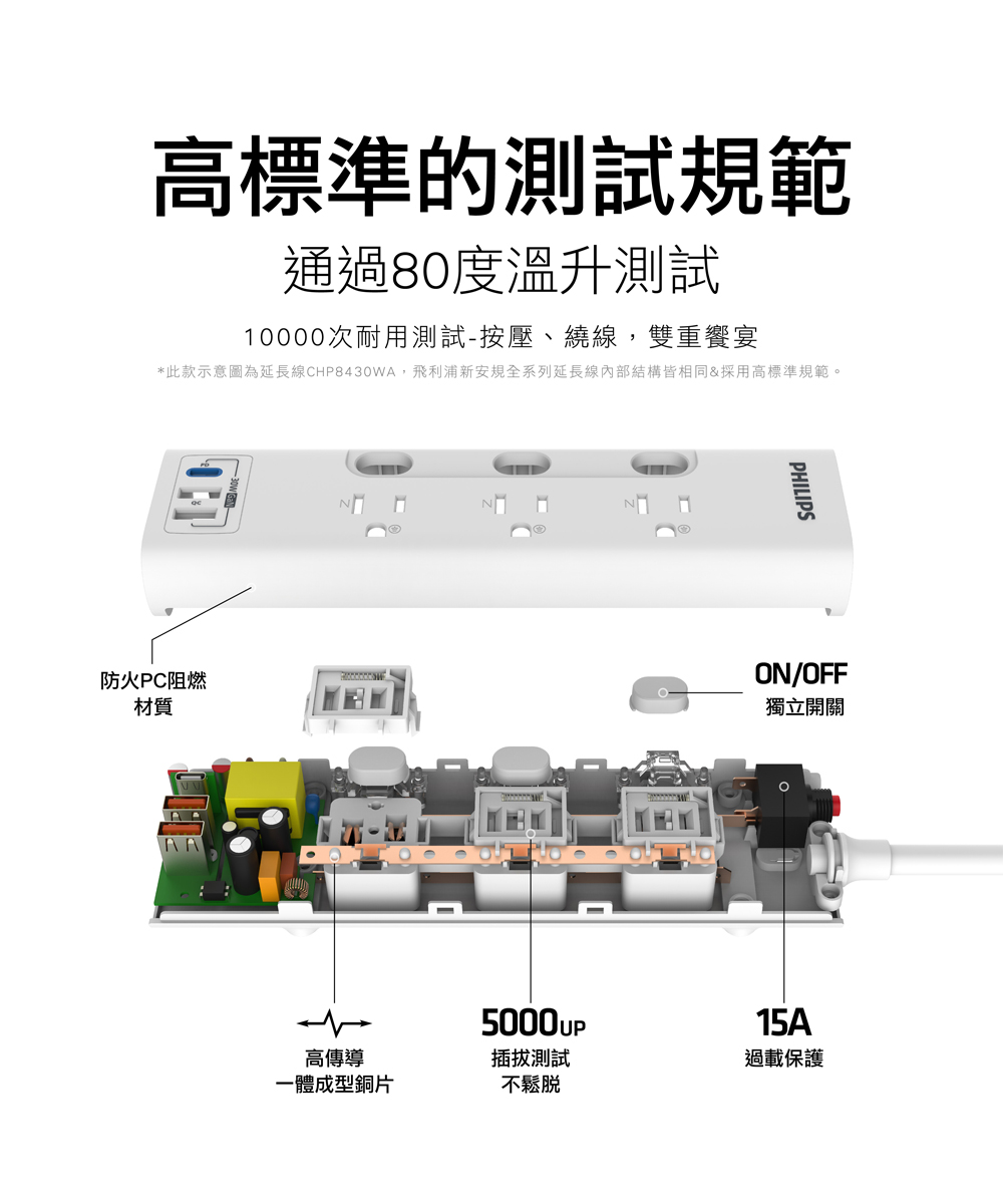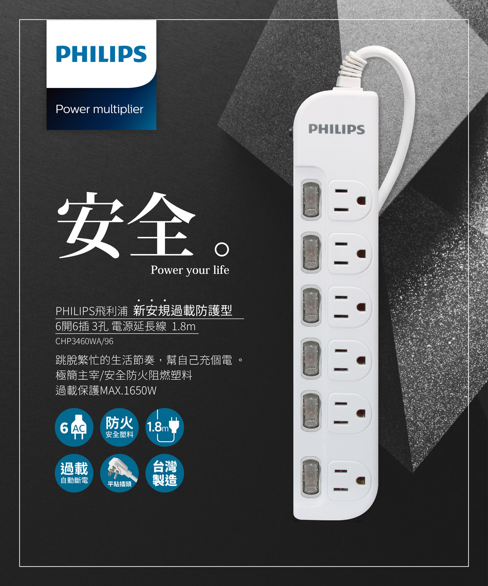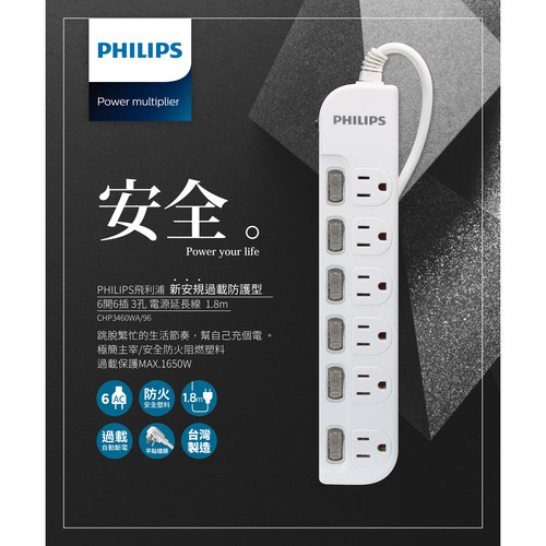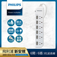 【Philips 飛利浦】延長線六開六插1.8M(白)CHP3460WA