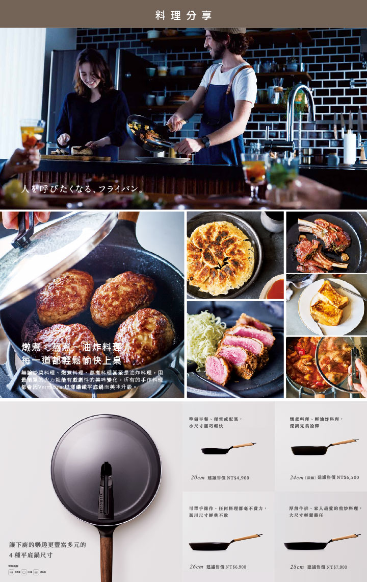 - 輕量:薄度僅有1.5mm、重量僅有1.05kg的極輕感琺瑯鑄鐵平底鍋
