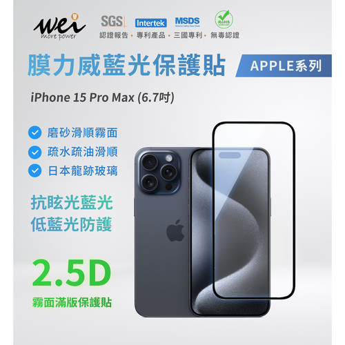 IPhone15 ProMax膜力威滿版玻璃保護貼-霧面抗藍光