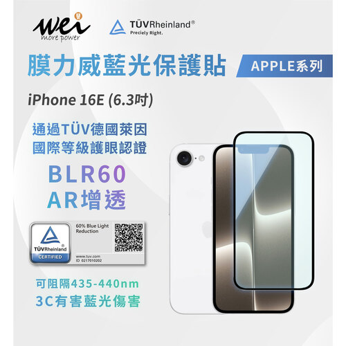 IPhone16e 膜力威德國萊因TÜVBLR60 藍光透明玻璃貼-滿版