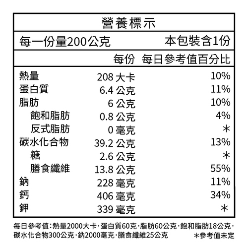 可以單吃或取代白飯,滿足且無負擔。熱量208大卡、增加飽足感、身體無負擔,提供鈣質來源,維持骨骼牙齒健康外,有助於肌肉與心臟的正常收縮。