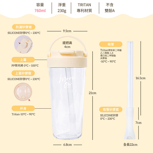 【760ml 清透X好型 輕飲時光點亮盛夏!】 自定義你的下午茶!專為手搖飲量身訂做的純透完美環保杯,杯身採用無毒耐磨TRITAN材質,可耐冰耐熱(-10°C~90°C)不含雙酚A,材質安全又安心!杯底貼心圓弧設計,讓料好吸不堆積,搭配專為手搖飲設計的彈跳粗吸管,可輕鬆享用飲品各種配料,吸管還能收納進杯蓋~ 獨家專利杯蓋設計,配件一體成型省下拆卸清洗的煩惱,杯口吸管+直飲經典雙飲設計,4cm隱藏手拎提把,便攜提著走! 出遊方便好攜帶!朋友聚會好可愛!上班上學好夥伴!拍照打卡最上鏡!隨行提這杯響應環保,喝飲料還能折5元!