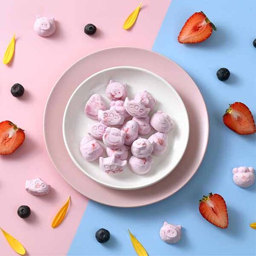 米森與國際大廠合作,採用超低溫急速冷凍技術,製作出濃縮五倍,並可常溫保存的咬咬優格,完整保留優格營養,幫助維持消化道機能,改變細菌叢生態,讓全家人都可以安心享受入口即化的微酸果香。