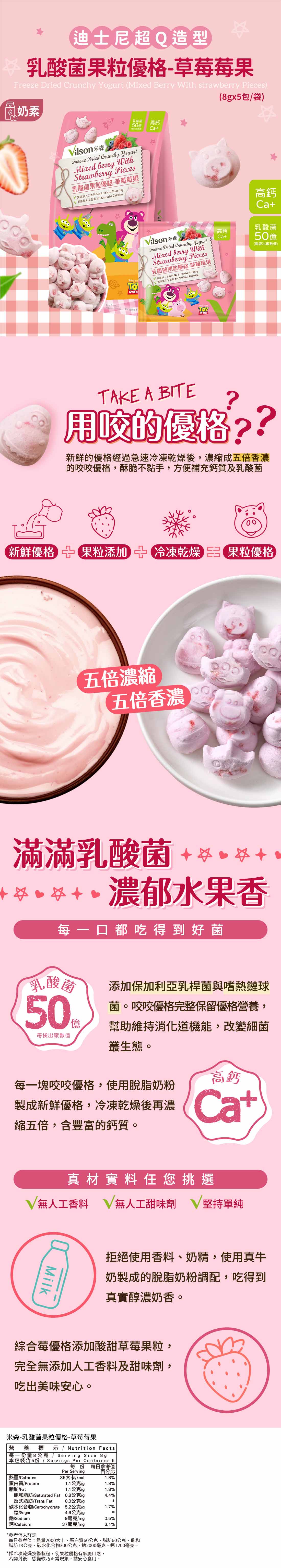 米森與國際大廠合作,採用超低溫急速冷凍技術,搭配純淨無添加冷凍綜合莓果配方,製作出濃縮五倍,並可常溫保存的咬咬優格,完整保留優格營養,幫助維持消化道機能,改變細菌叢生態,讓全家人都可以安心享受入口即化的微酸果香。