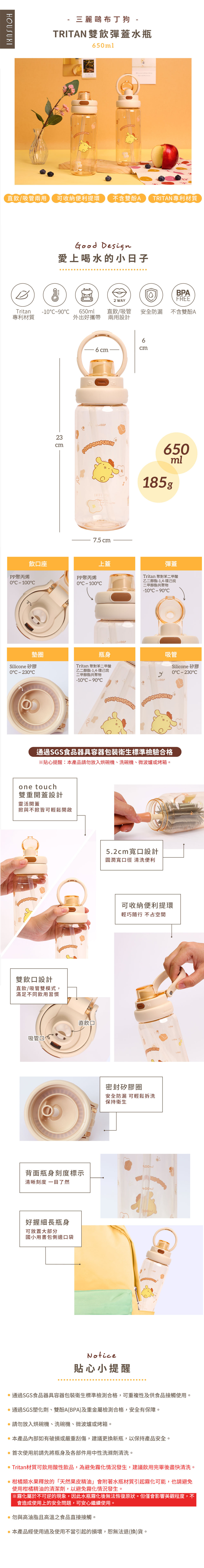 布丁狗就這樣走進你的生活啦 🤍 650ml剛剛好的容量,輕巧不佔空間,放進包包隨行帶著走也毫無負擔。瓶身選用無毒耐磨的 Tritan 材質,透明清爽又安心,每一口喝水都很放心。 雙飲設計不論是想直接暢快喝或吸管慢慢喝都很順手,一瓶能滿足不同情境。ONE TOUCH 彈蓋設計輕鬆開蓋,忙碌時刻喝水依然優雅從容。搭配便利提環,輕量好攜帶,讓布丁狗陪你把補水這件小事,變成每天都期待的可愛日常!