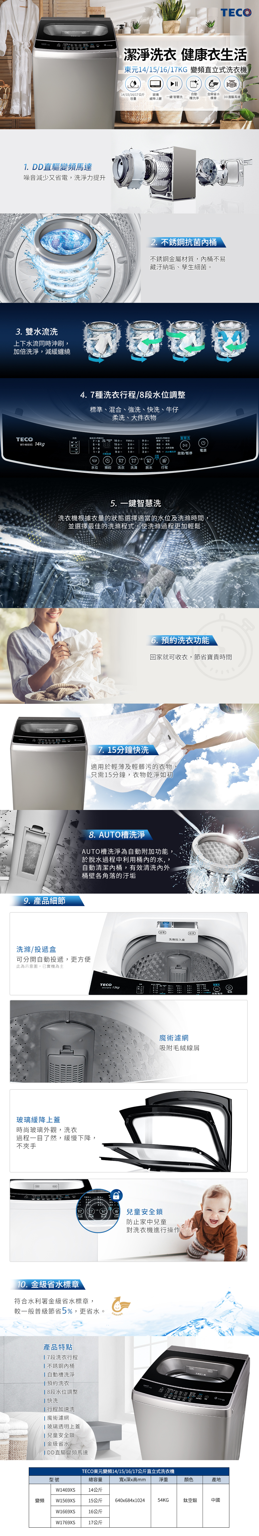 - 7種洗衣行程/8段水位調整/預約洗衣功能/快洗