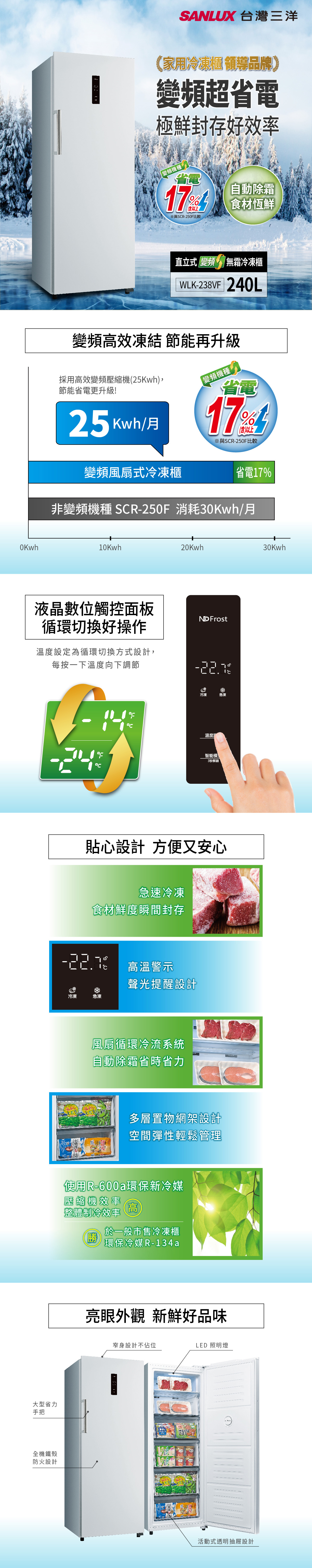 台灣三洋_240公升單門變頻冷凍櫃(白)_WLK-238VF