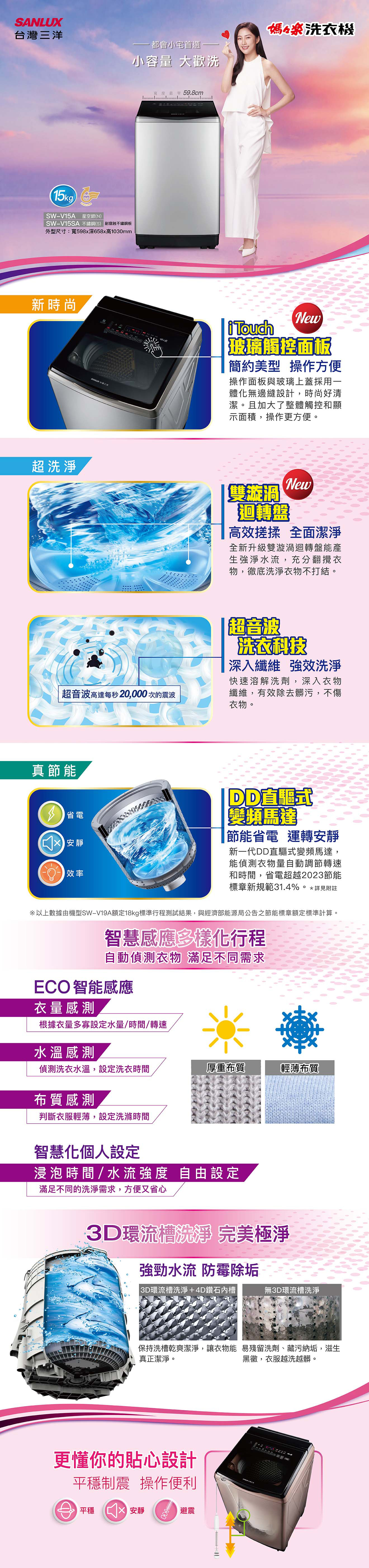 台灣三洋_15公斤直立式變頻內外不鏽鋼洗衣機_SW-V15SA
