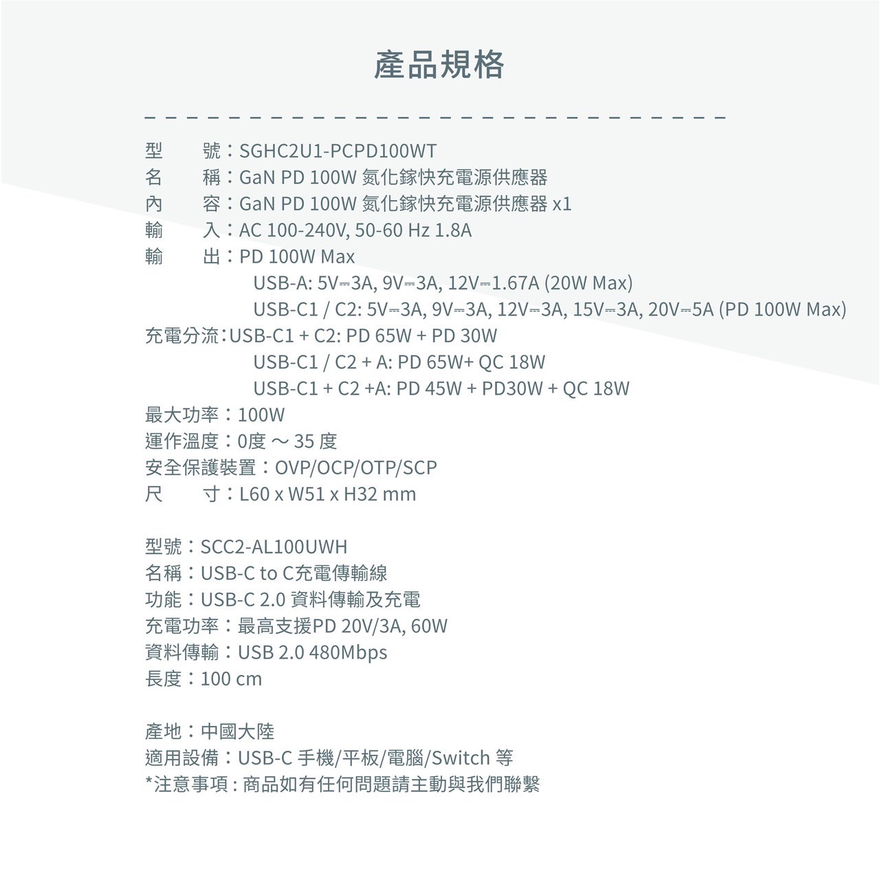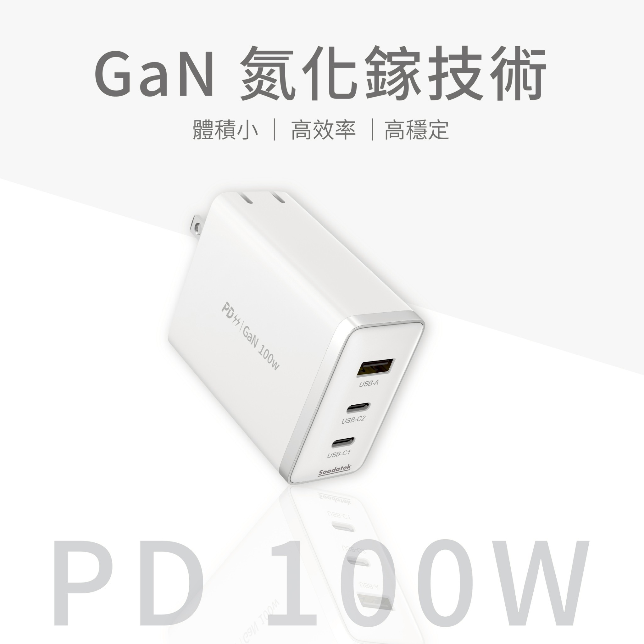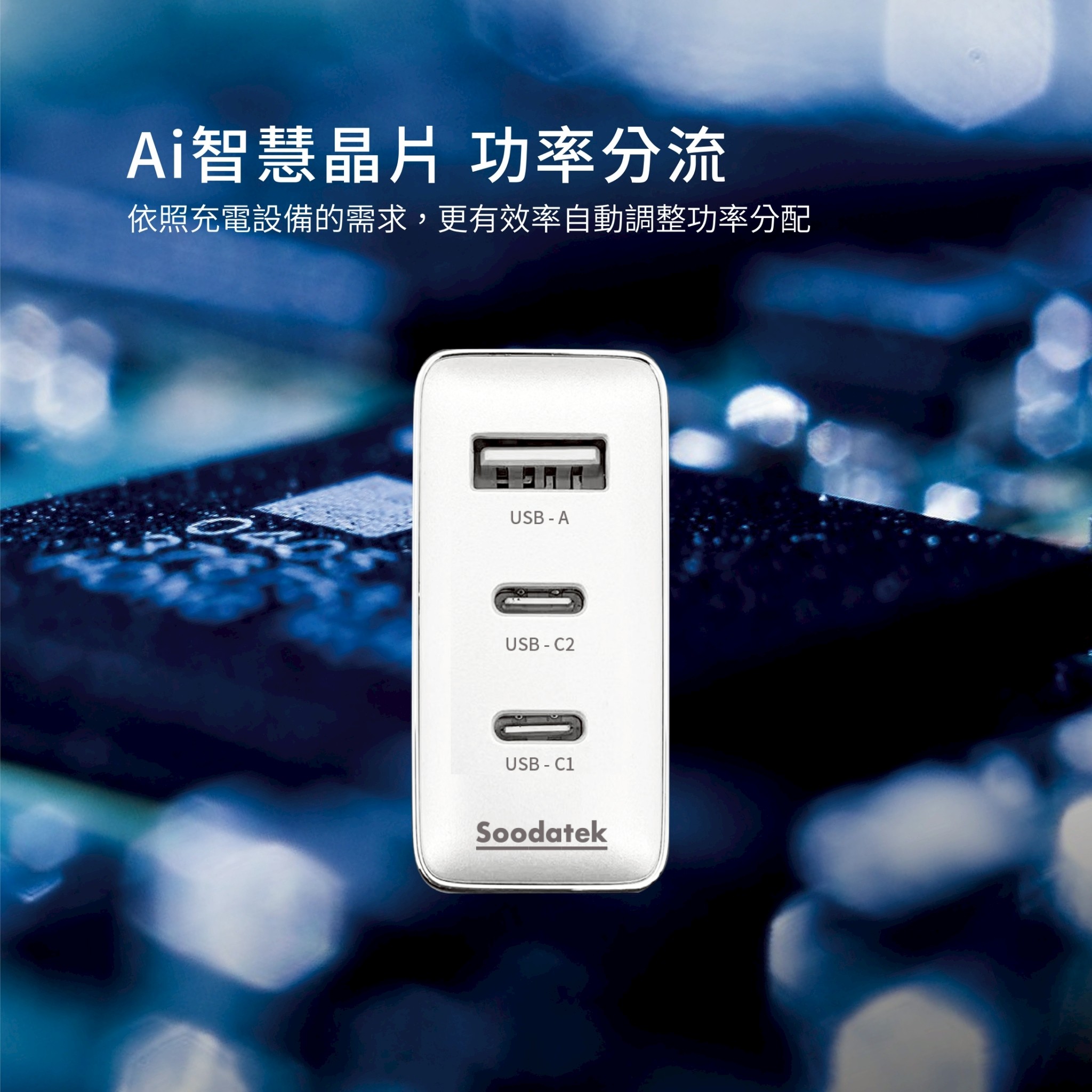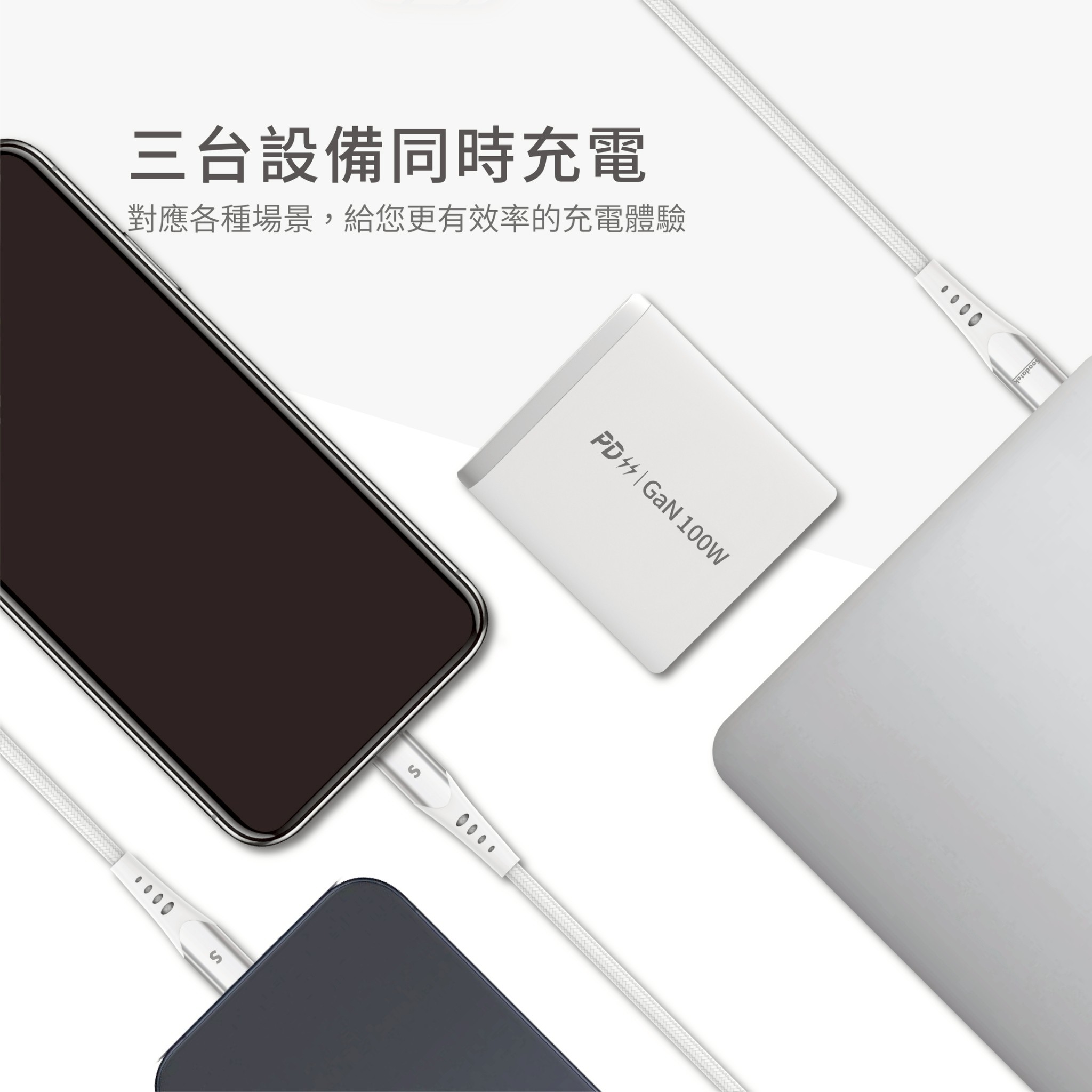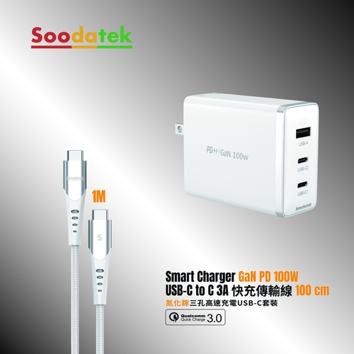 SOODATEK GaN PD 100W 三孔高速充電器 +TYPE C to TYPE C 充電傳輸線1M SGHPD100-CC100WH