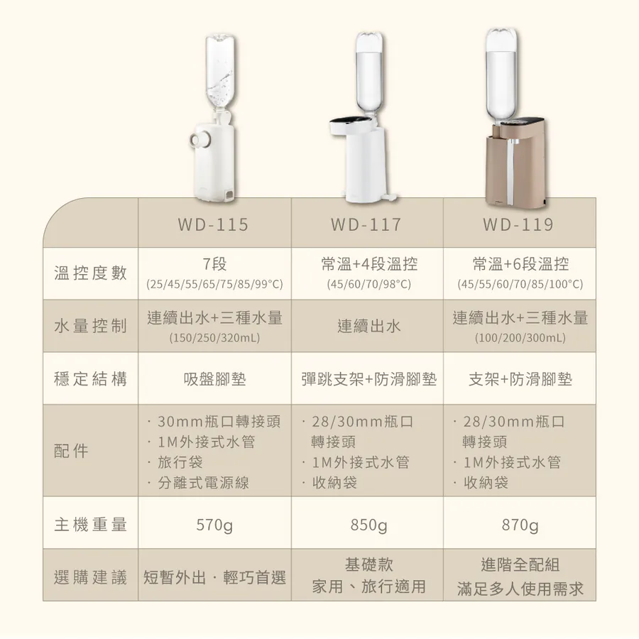 - 配件:30mm瓶口轉接頭、1M外接式水管、分離式電源線、旅行袋
