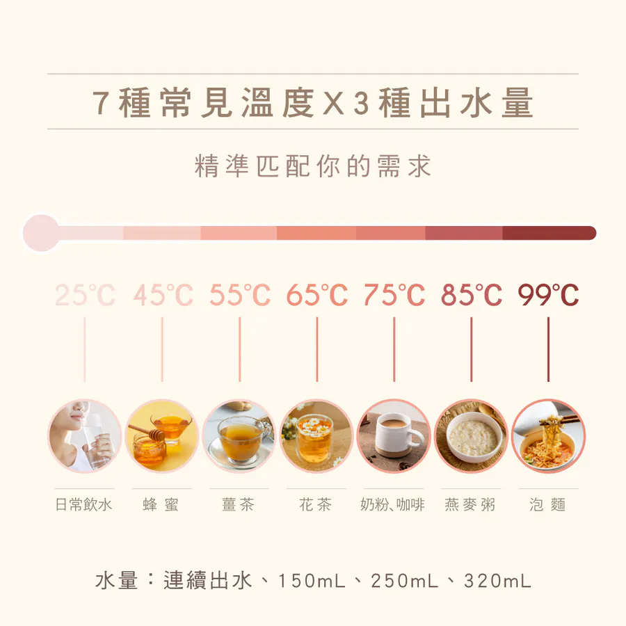- 連續出水+三種水量150mL/250mL/320mL,自由選擇