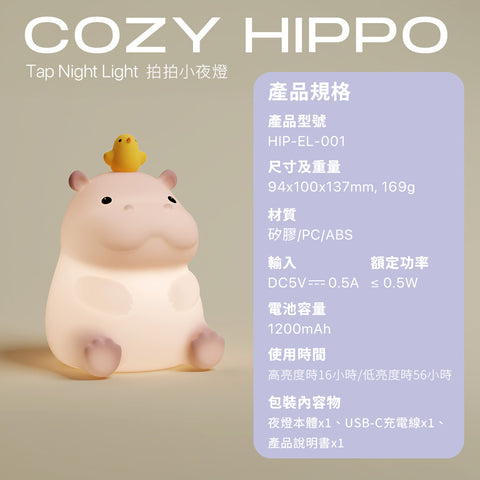 • 包裝內容物:Hipporizz Cozy Hippo 拍拍小夜燈*1 + USB-C充電線*1 +保固六個月