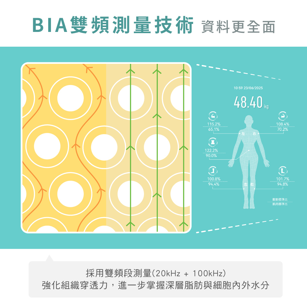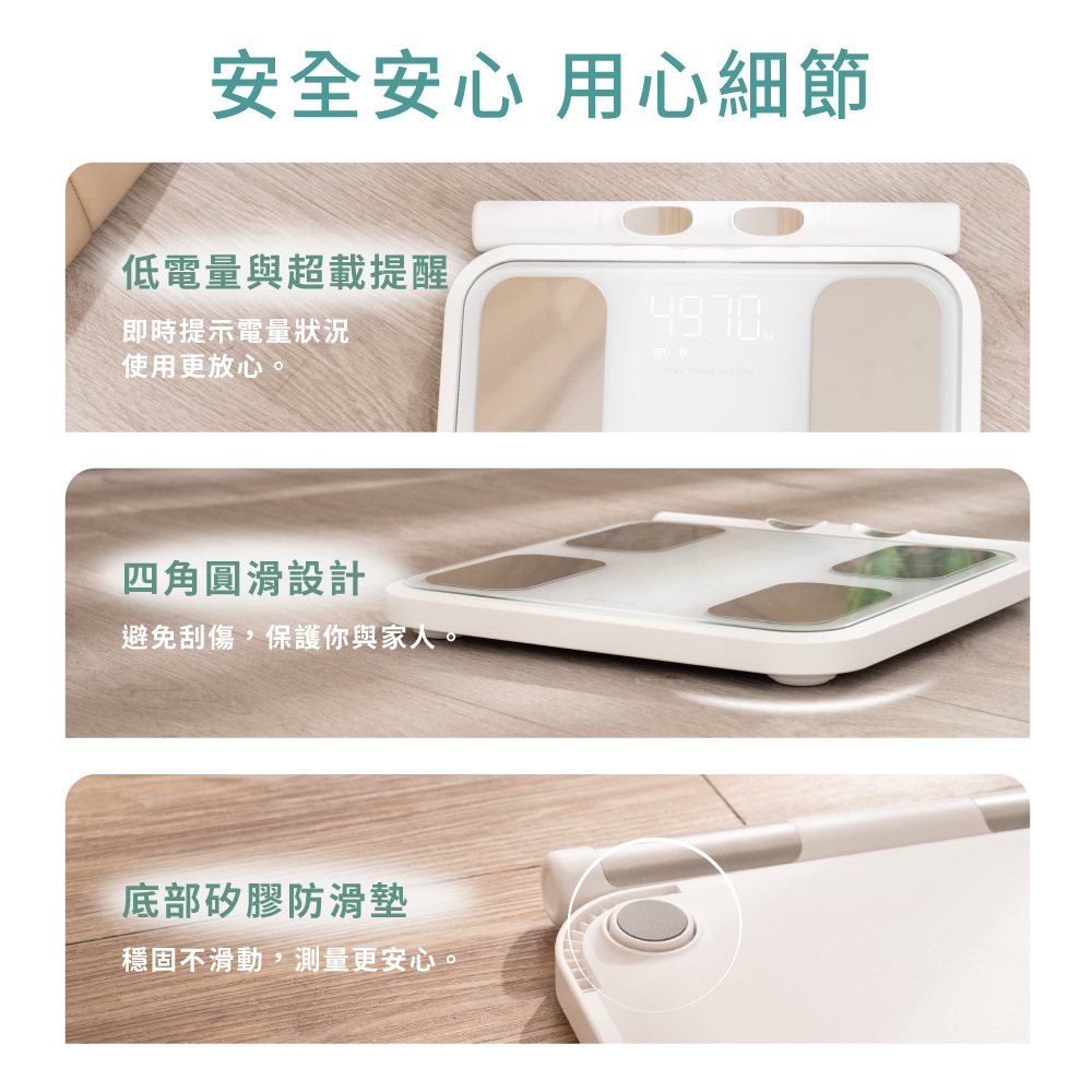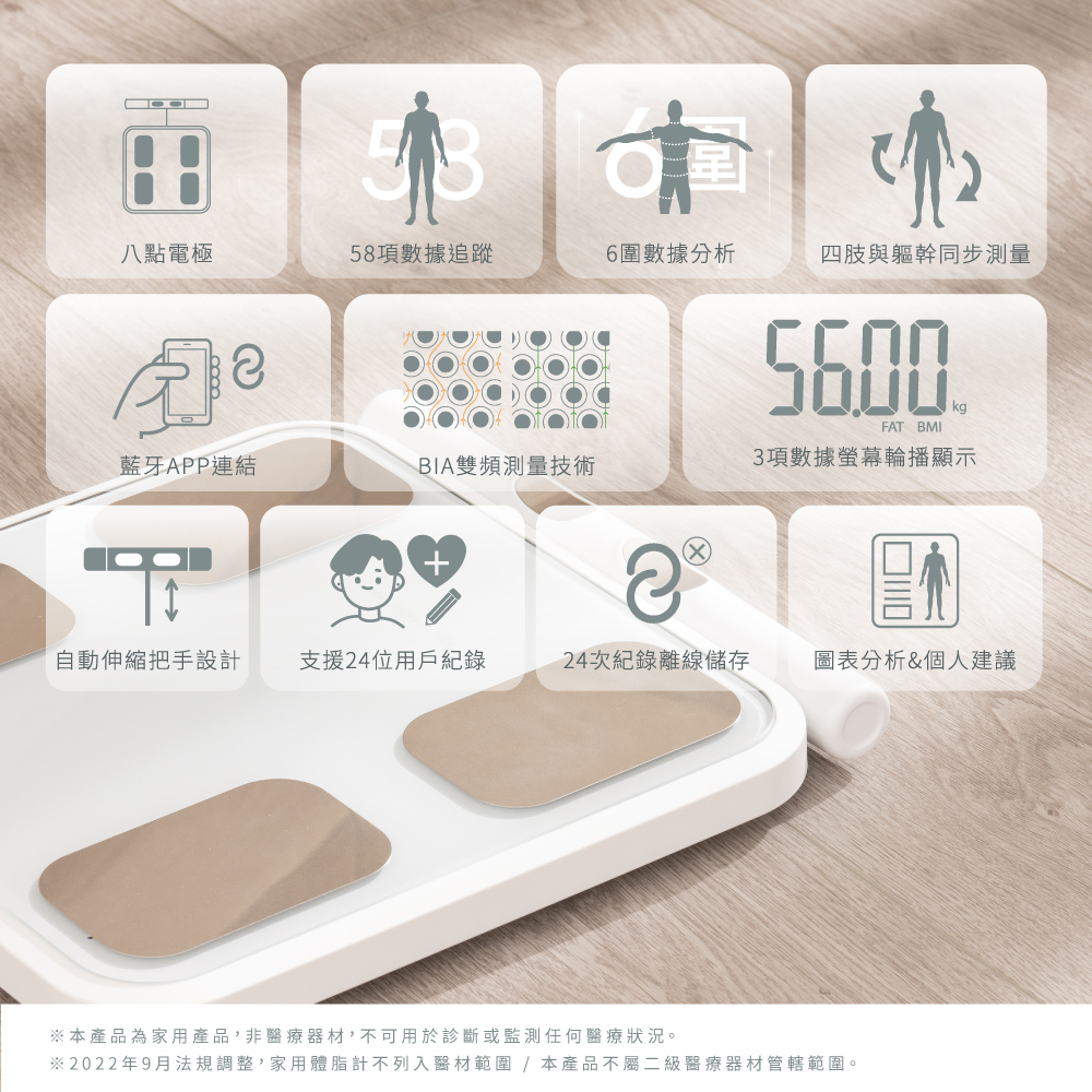 - ‧ 八電極精準測量-全方位數據分析,掌握身體變化