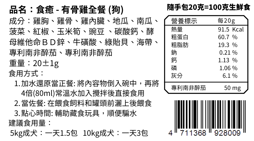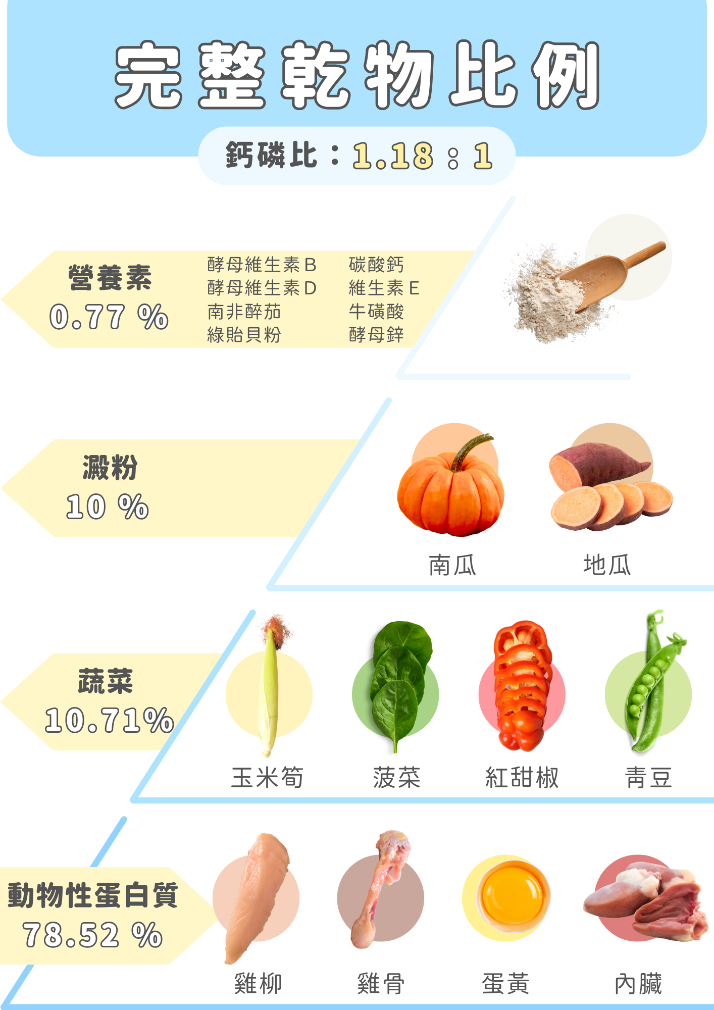 成分:雞胸、雞骨、雞內臟、地瓜、南瓜、菠菜、紅椒、玉米筍、豌豆 、綜合營養添加、專利南非醉茄