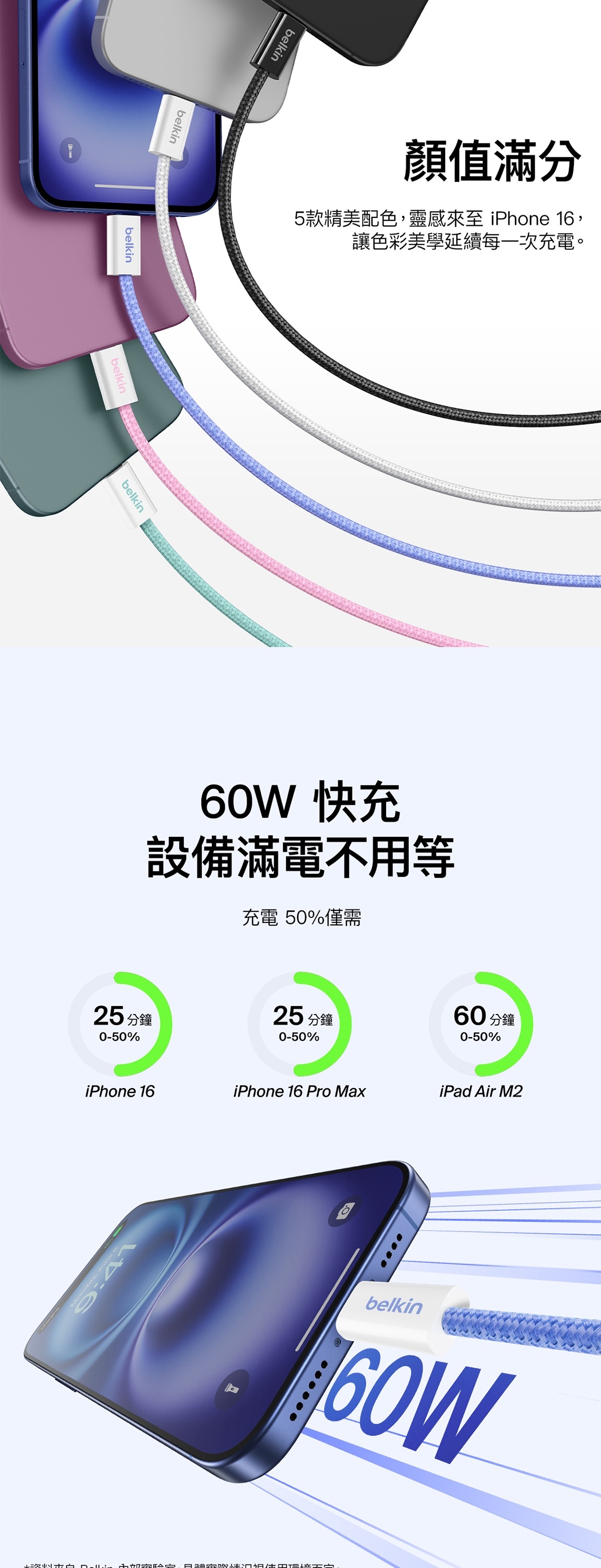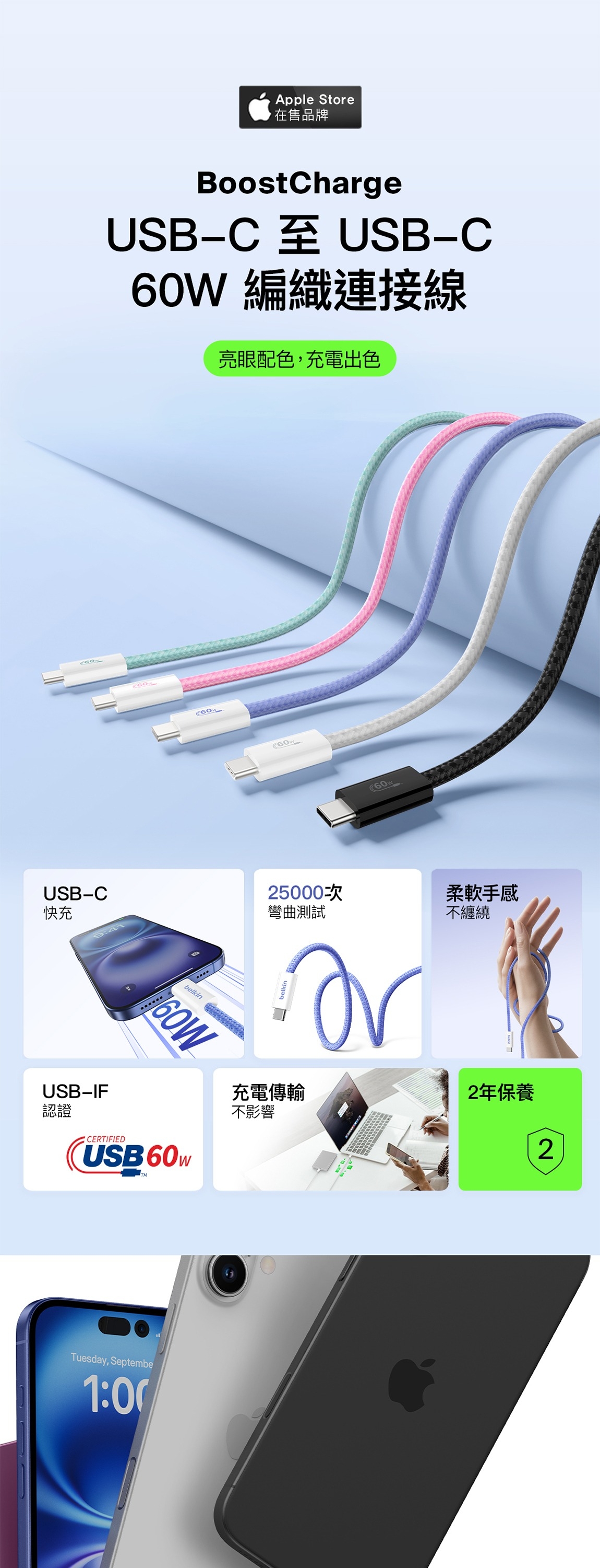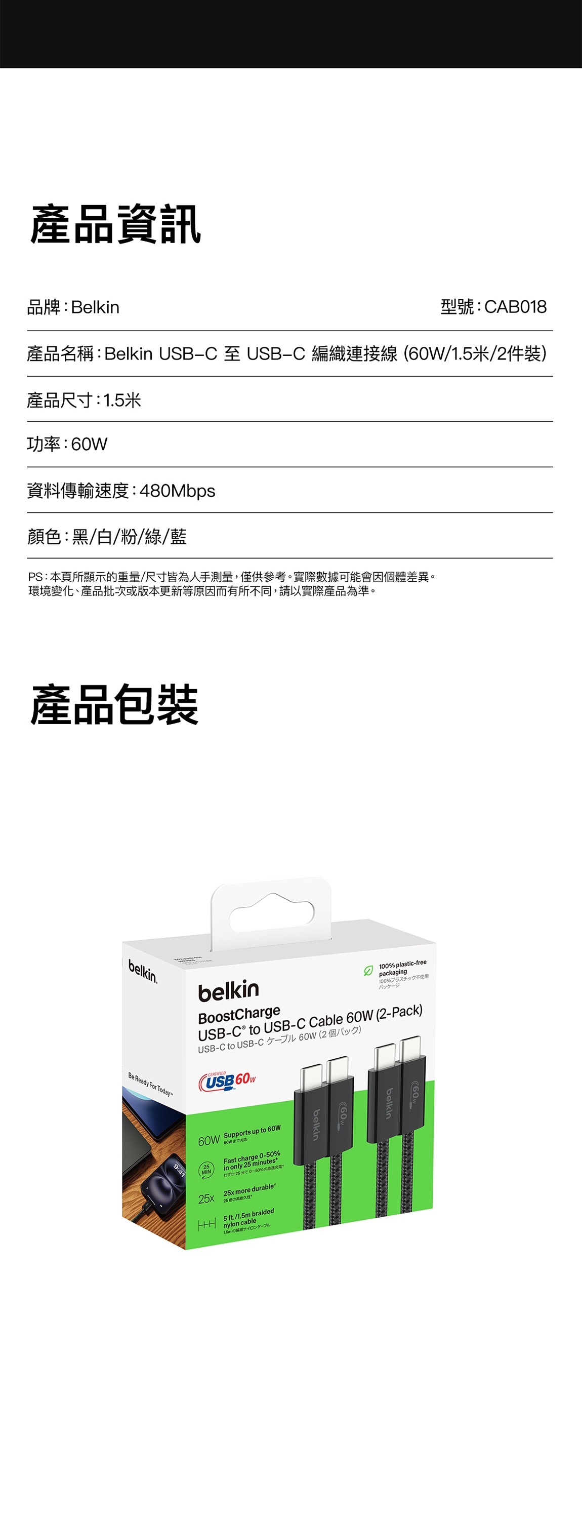 Belkin BoostCharge Type C編 織連接充電線 (60W/1.5米/2件組)-黑