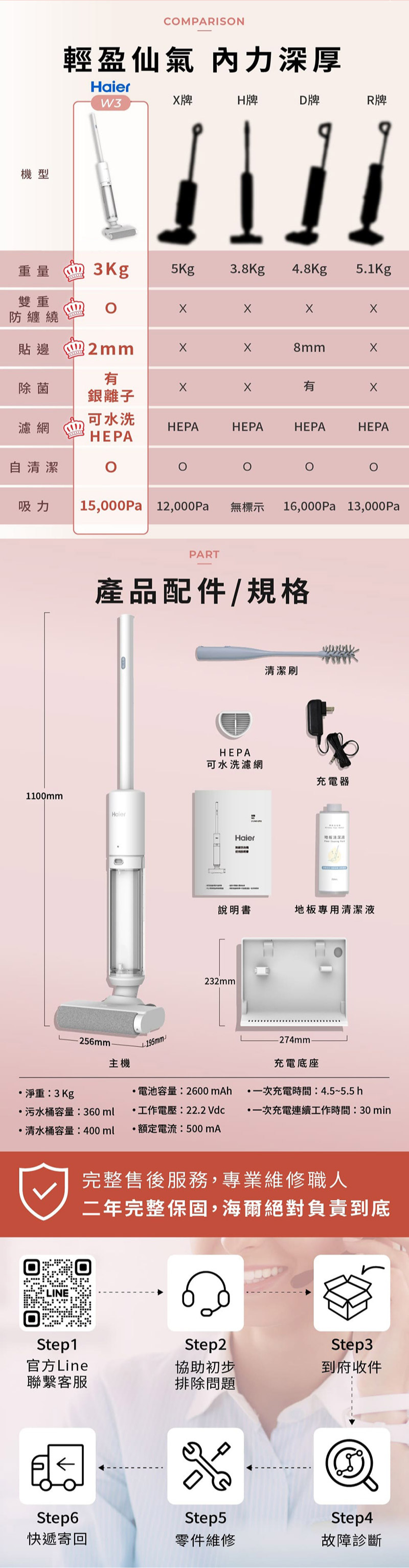 ◆內容物:主機、清潔刷、HEPA可水洗濾網、充電器、說明書、地板專用清潔液、充電底座