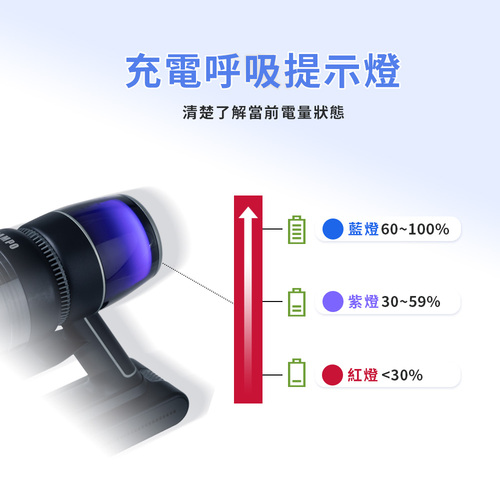 ◆充電呼吸燈提示,紅、紫、藍三段充電燈色變化,一目瞭然。