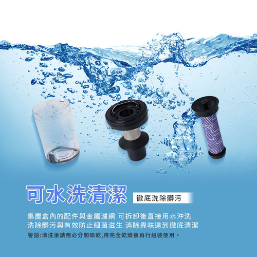 ◆集塵盒內濾網、配件可水洗清潔,徹底洗除髒污。