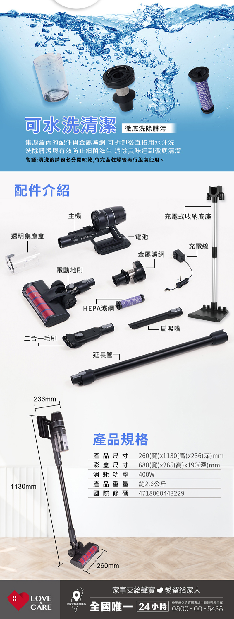 ◆主機尺寸(含鋁管地刷):寬260 x 高1130 x 深236 (mm)