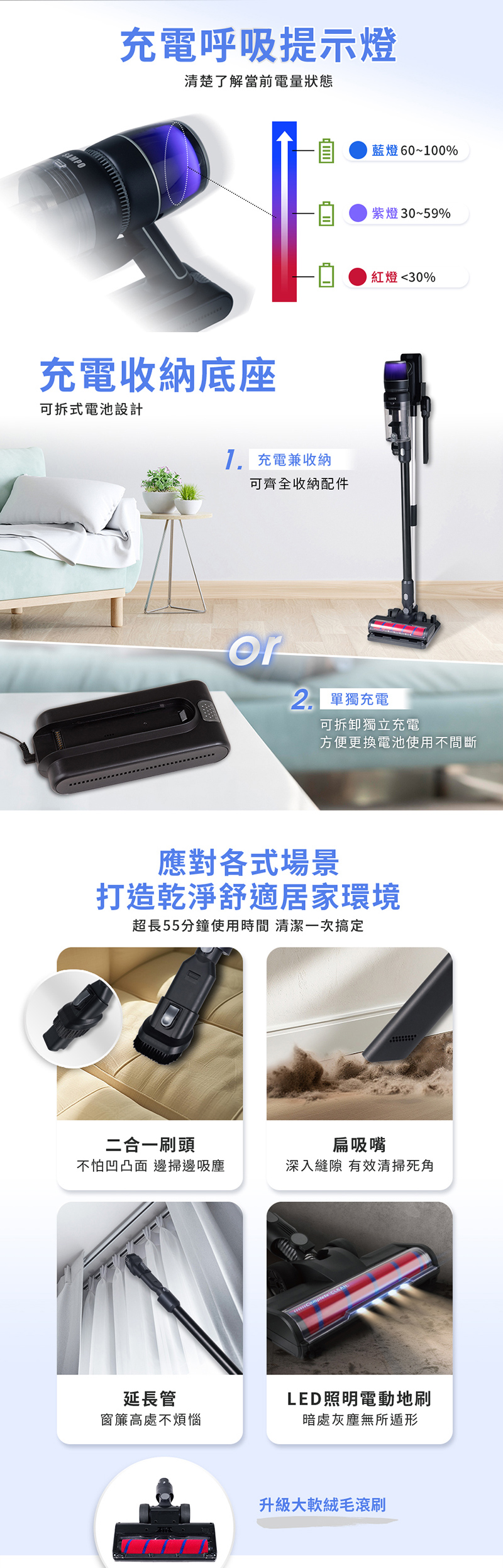 ◆升級大軟絨毛滾刷,電動地刷配備LED燈,暗處灰塵無所遁形。