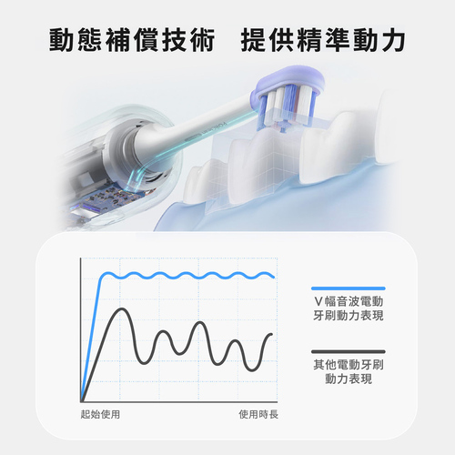 ◆動態補償技術,以22000次/秒的頻率精準補償動力,有消解決傳統電動牙刷遇阻力時動力衰減、力度下降等問題