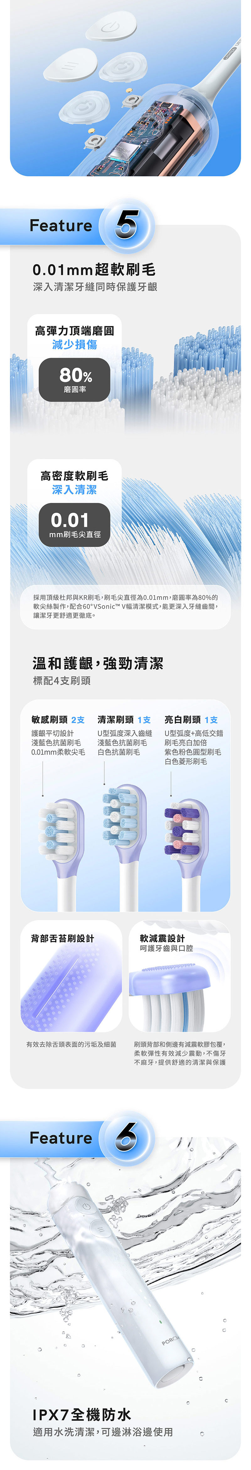 ◆採用杜邦與KR刷毛!高密度直徑0.01mm軟刷毛、高彈力磨圓率80%軟尖絲設計,搭配60°VSonic™ V幅清潔模式,減少損傷同時更深入牙縫齒尖徹底清潔!