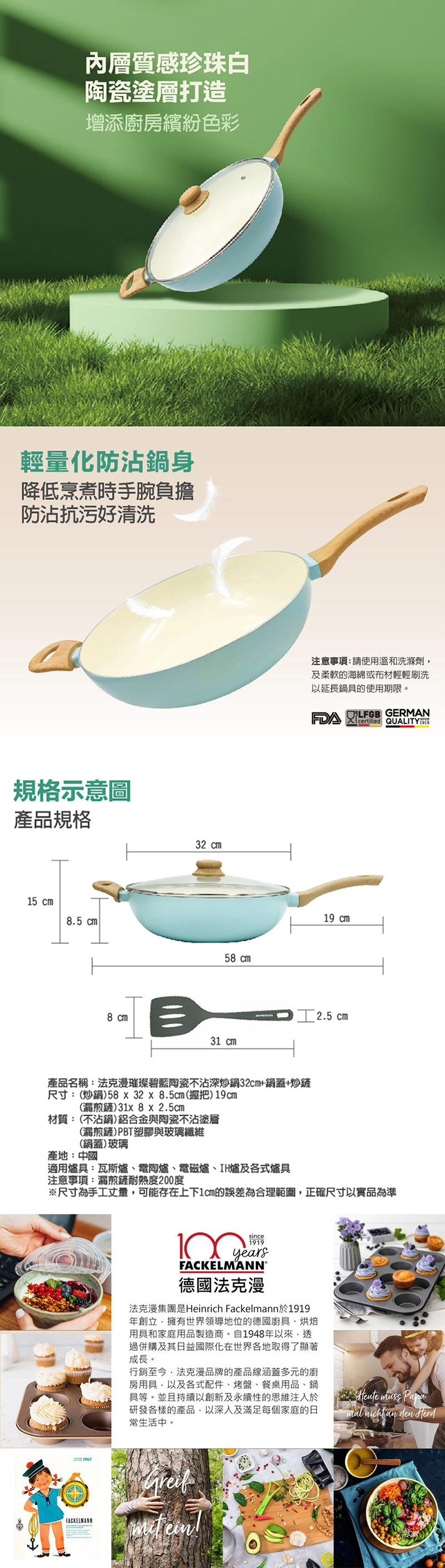 德國Fackelmann 璀璨碧藍陶瓷不沾深炒鍋 32cm+鍋蓋+炒鏟三件組(適用電磁爐)_5550881