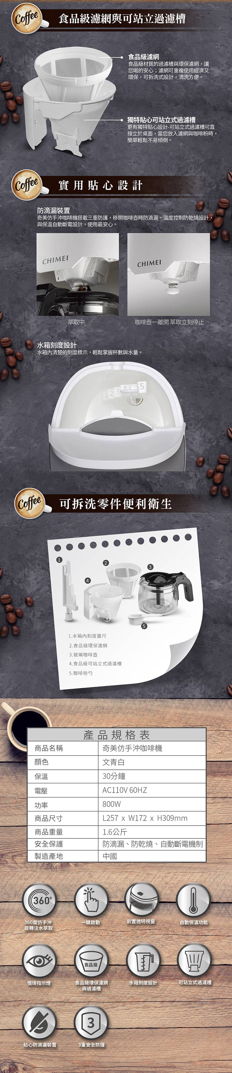 ◆配件:玻璃咖啡壺、食品級環保濾網、水箱內刻度量尺、可站立式過濾槽、咖啡粉勺