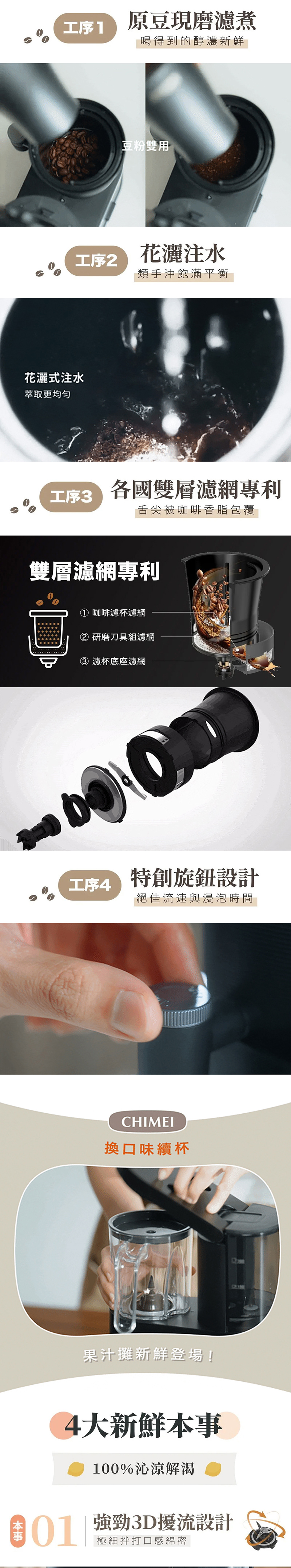 ◆咖啡豆研磨濾煮、咖啡粉、果汁、碎冰,4種需求一次滿足,亦可用於沖泡茶品。