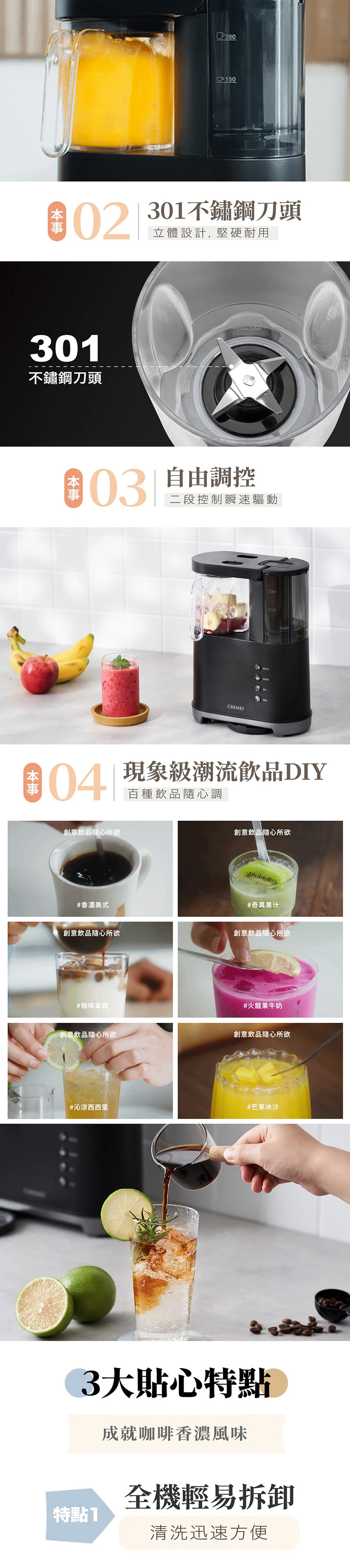 - ◆咖啡豆/粉+果汁+碎冰+泡茶,一機多用